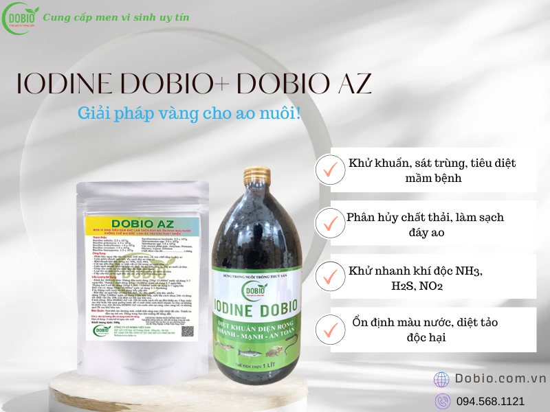 - Song song đó, việc sử dụng Iodine Dobio 2 lần/tháng giúp sát trùng nước ao, diệt khuẩn, nấm, nguyên sinh động vật và ký sinh trùng gây bệnh. Iodine Dobio còn giúp phòng ngừa hiệu quả các bệnh ngoài da như lở loét, trắng mắt, phù đầu, tuột nhớt… đặc biệt trong giai đoạn giao mùa hoặc dịch bệnh bùng phát.